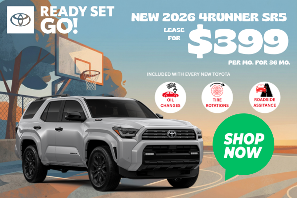 *Qualified lessees can lease a new 2026 4Runner SR5 for $399 per month for 36 months with $4,398 Due At Signing. Security Deposit waived. Lease excludes tax, title, license, registration fees, and dealer options and charges. Terms available on approved credit through Southeast Toyota Finance. Not all customers qualify. Security deposit required with exception of prior Southeast Toyota Finance (SETF) financing history and/or SETF credit rating in which a security deposit may be waived. Dealer contribution may vary and could affect lease payment. Individual dealer prices, other terms and offers may vary. Must lease from participating dealer's stock and terms are subject to vehicle availability. Lessee responsible for maintenance, excess wear and use, and will pay $0.18 per mile for all mileage over 12,000 miles per year. $350 disposition fee is due at lease end. Cannot be combined with SETF Finance Cash, Down Payment Assistance, Trade-in Assistance, Customer Cash, APR, Finance Subvention Cash. Offer available in AL, FL, GA, NC, SC; void where prohibited. All offers Excludes tax, tag, electronic titling fee, registration, reconditioning and $899.99 Dealer documentation fee. Offer ends 3/31/26