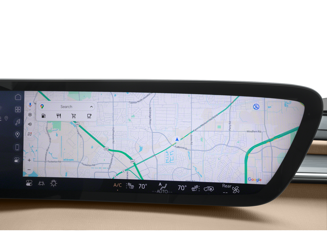 - Infotainment Center, customizable ultrawide 30" diagonal screen with Google built-in. Provides navigation capability, connected apps, personalized profiles for each driver's settings, Natural Voice Recognition and Phone Integration for Wireless Apple CarPlay/Wireless Android Auto for compatible phones